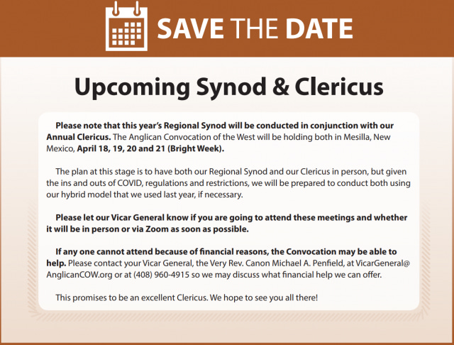 Clergy of the Convocation of the West and Delegates for Synod, please remember to register for the upcoming Synod and Clericus at https://anglicancow.org/pages/synod-2022.php
